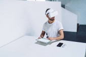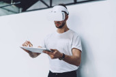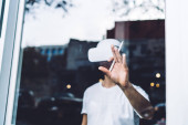 Zdjęcie "Szczęśliwy człowiek wyciąga rękę z cyfrowym rysikiem do interaktywnego dotyku stojąc wewnątrz i korzystając z zestawu słuchawkowego wirtualnej rzeczywistości, pozytywny hipster facet w goglach projektujących nowoczesną przestrzeń architektoniczną" może być wykorzystywane do celów osobistych i komercyjnych zgodnie z warunkami zakupionej licencji Royalty-free. Obraz jest dostępny do pobrania w jakości wysokiej rozdzielczości do 5760x3840.