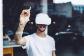 Szczęśliwy człowiek wyciąga rękę z cyfrowym rysikiem do interaktywnego dotyku stojąc wewnątrz i korzystając z zestawu słuchawkowego wirtualnej rzeczywistości, pozytywny hipster facet w goglach projektujących nowoczesną przestrzeń architektoniczną