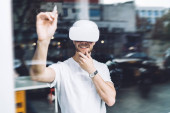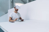 Pozytywny człowiek w elektronicznych okularach cyfrowych do testowania rzeczywistości cyberprzestrzeni w pomieszczeniach przy użyciu wysokiej technologii do tworzenia wirtualnej sieci, udanego męskiego testowania wyimaginowanego środowiska
