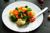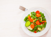 Mieszane warzywa. zielona fasola, brokuły i marchew w białej płycie na drewnianym tle stołu.