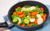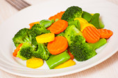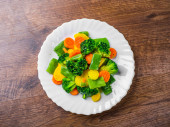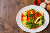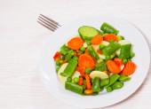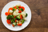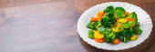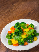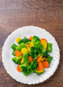 Mieszane warzywa. zielona fasola, brokuły i marchew w białej płycie na drewnianym tle stołu.