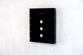 dotykowy szklany przełącznik światła czarnego koloru na białej ścianie w pobliżu okna, zbliżenie inteligentnego sterowania domem z 3 przyciskami.