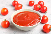 Kompozycja z miską sosu pomidorowego na szarym stole