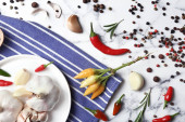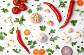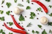 Płaska kompozycja z zieloną pietruszką, rozmarynem, pieprzem i grzybami na białym tle