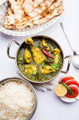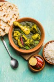 Palak/szpinak kurczak lub Murg Saagwala służył w misce z naan i ryżu