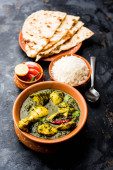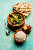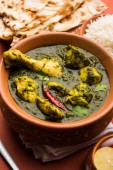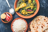 Palak/szpinak kurczak lub Murg Saagwala służył w misce z naan i ryżu