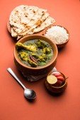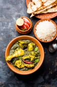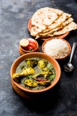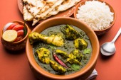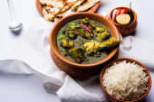 Palak/szpinak kurczak lub Murg Saagwala służył w misce z naan i ryżu