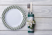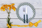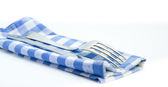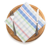 pusty płyta z widelec, nóż i serwetka na białym tle
