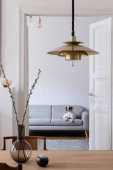 Nowoczesne wnętrze wnętrza salonu z designernym drewnianym stołem, krzesłami, sofą i białymi podstawkami ze stylowymi akcesoriami. Abstrakcyjne obrazy na ścianie. Elegancki wystrój wnętrz. Makiety ramki plakatu.