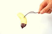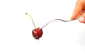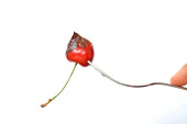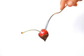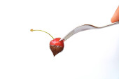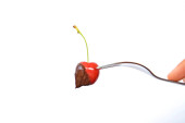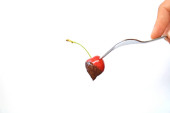 Świeża wiśnia, przyklejona na końcówce widelca, DIP w płynnej czekoladzie-zbliżenie i izolowane