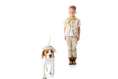 Zdjęcie "pełny widok długości przedszkolaka badacz chłopiec z psem Beagle w kapeluszu na białym" może być wykorzystywane do celów osobistych i komercyjnych zgodnie z warunkami zakupionej licencji Royalty-free. Obraz jest dostępny do pobrania w jakości wysokiej rozdzielczości do 5760x3840.
