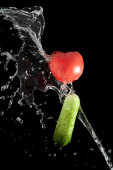 dojrzałe pomidory i ogórki upada głęboko pod wodą z duży splash.