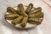 Widok z góry tradycyjnej kuchni tureckiej, nadziewane liście winorośli z ryżem