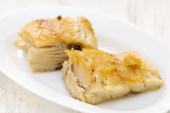 grono papka z bananem napełniania na białym talerzu
