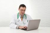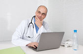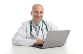 wesoły lekarz siedzi przy biurku działa na laptopie