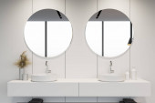 Zdjęcie "Podwójna umywalka i plakat w szarej łazience" może być wykorzystywane do celów osobistych i komercyjnych zgodnie z warunkami zakupionej licencji Royalty-free. Obraz jest dostępny do pobrania w jakości wysokiej rozdzielczości do 5760x3840.