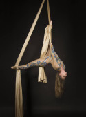 Sportowa dziewczyna w kolorze Burgundii wykonuje ćwiczenia gimnastyka i cyrku na białym jedwabiu, w Contra światła.