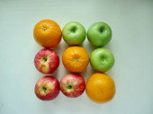 Owoce podawane na tacce i sfotografowane na białej płycie