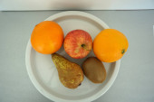 Owoce podawane na tacce i sfotografowane na białej płycie