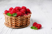 dojrzałe słodkie maliny w kosz na drewniane tła
