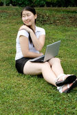 uśmiechający się młoda dziewczyna z laptopa na zewnątrz