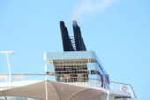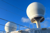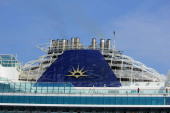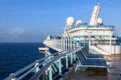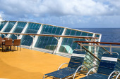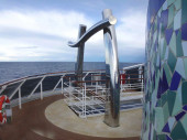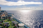 Ocean Atlantycki, Brilliance of the Seas-kwi 2017: ściana wspinaczkowa na górnym pokładzie statku wycieczkowego przeciwko błękitne niebo z chmur