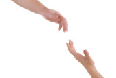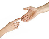 Kobieca ręka idzie do męskiej dłoni na białym tle.