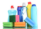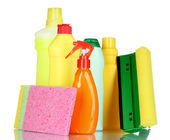 różnego rodzaju środki do czyszczenia kuchni i kolorowe gąbki, na białym tle