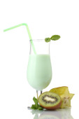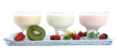 pyszne jogurty z owocami w okularach na białym tle