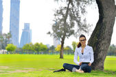 młoda kobieta skacze w parku