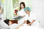 portret lekarza z jego współpracowników, rozmowy z pacjentem w tle