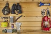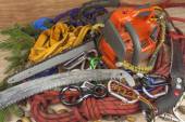 Sprzęt wspinaczkowy dla bezpiecznych sportowców wspinaczkowych. Rama ze sprzętu bezpieczeństwa przy wspinaczce, speleologii, alpinizmu, na drewnianym tle z kopią przestrzeni.