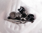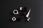 zestaw starych czarno-białych akcesoriów piercing na białym tle. Wyizolować