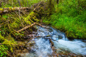 Woda z wiosennego śniegu topi się na kłody i głazy na McGillivray Creek między Whitecroft i Sun Peaks w Shuswap Highlands w regionie Okanagen w Kolumbii Brytyjskiej, Kanada
