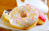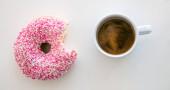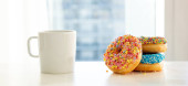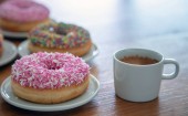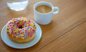 Pierścieniowy i filiżanka do kawy na drewnie. Widok z bliska