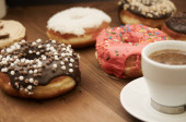 Pączki i filiżanka do kawy na drewnie. Widok z bliska