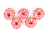 Pączki z kolorową dekoracją na białym tle koloru. Widok z góry