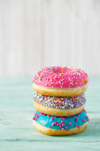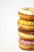 Pączki z kolorową dekoracją na białym tle koloru. Widok z góry