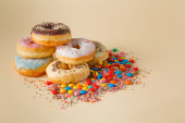 Zdjęcie "Pączki na białej tabeli kolorów. Widok zbliżenie" może być wykorzystywane do celów osobistych i komercyjnych zgodnie z warunkami zakupionej licencji Royalty-free. Obraz jest dostępny do pobrania w jakości wysokiej rozdzielczości do 5760x3840.
