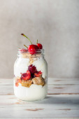 Nie pieczone Sernik z wiśniami w szklanych słoikach, świeżych wiśni i mięty na szarym tle kamienia. Zdrowy deser. Kopiuj przestrzeń.
