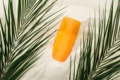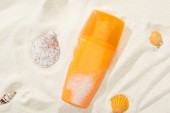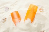 pomarańczowe butelki z filtrem przeciwsłonecznym na złotym piasku z muszelek