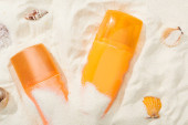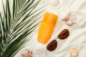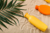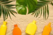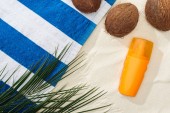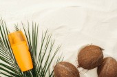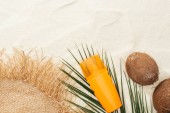 Widok z góry liści palmowych, Orzechy kokosowe i kobiece strony z filtrem przeciwsłonecznym na piasku