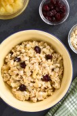 Świeże domowe wegańskie gotowane jabłko, płatki owsiane, żurawina i cynamon owsianka, składniki z tyłu (Selective Focus, Focus w środku obrazu)