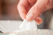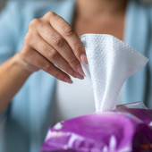 Chusteczki nawilżające: Kobieta podejmuje jedną wycierać z opakowania do czyszczenia