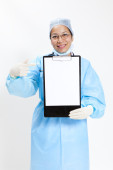 kobieta lekarz Wyświetlono przystanek gest na białym tle