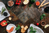Bruschettas z serem Philadelphia, szynką, Ogórkami i pomidorami podawane z czerwonym winem.