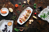 Zdjęcie "Bruschettas z serem Philadelphia, szynką, Ogórkami i pomidorami podawane z czerwonym winem." może być wykorzystywane do celów osobistych i komercyjnych zgodnie z warunkami zakupionej licencji Royalty-free. Obraz jest dostępny do pobrania w jakości wysokiej rozdzielczości do 5760x3840.
