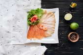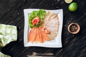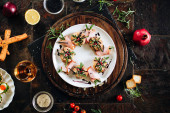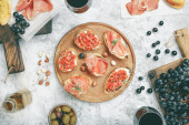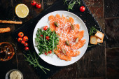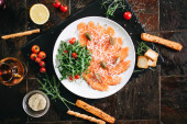 Przekąski z łososia, ser Philadelphia i koperek na białej płycie muszli z czerwonym winem.