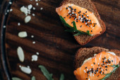 Przekąski ciasta francuskiego z łososiem, ser Philadelphia i koperek na białej płycie muszli