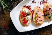 Przekąski ciasta francuskiego z łososiem, ser Philadelphia i koperek na białej płycie muszli